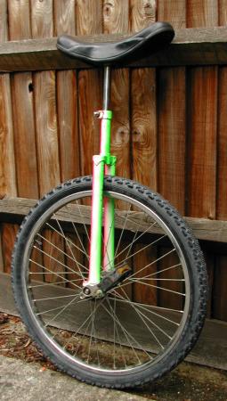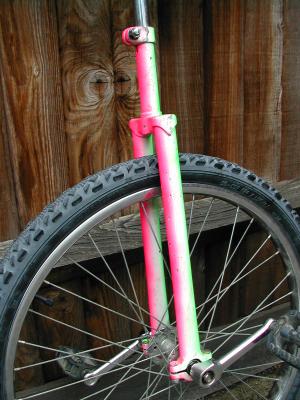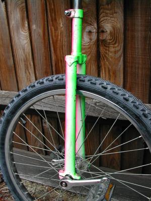 My unicycle has a slightly unusual colour scheme. For some reason, I decided to paint it one day. Presumably I thought a plain chrome unicycle going down the road wasn't eye-catching enough. I don't actually have pictures of it new, and ten years on it's looking a bit tatty, but here it is anyway. It's fluorescent green at the front, fluorescent pink at the back, and white at the sides. There's a matching seat-post which I generally have installed the other way round (pink front, green back), just for variety. That's not fitted in these photos because it doesn't adjust (the seat clamp scrapes the paint off), and the unicycle has recently been in use by a learner shorter than me, who had the seat right down, so I swapped it for a plain chrome one.
